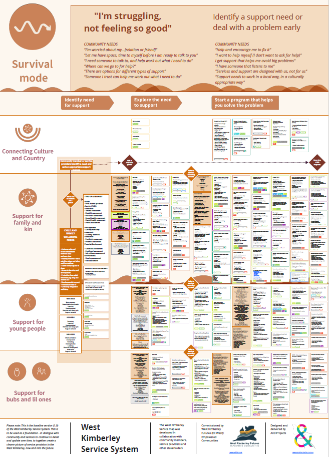 West Kimberley Futures is committed to supporting the use of the Service System Map as a practical tool to strengthen coordination and contribute to positive change in child, family, and youth wellbeing services. Service providers are encouraged to download and print the map and use it to assist community members in navigating available supports.
